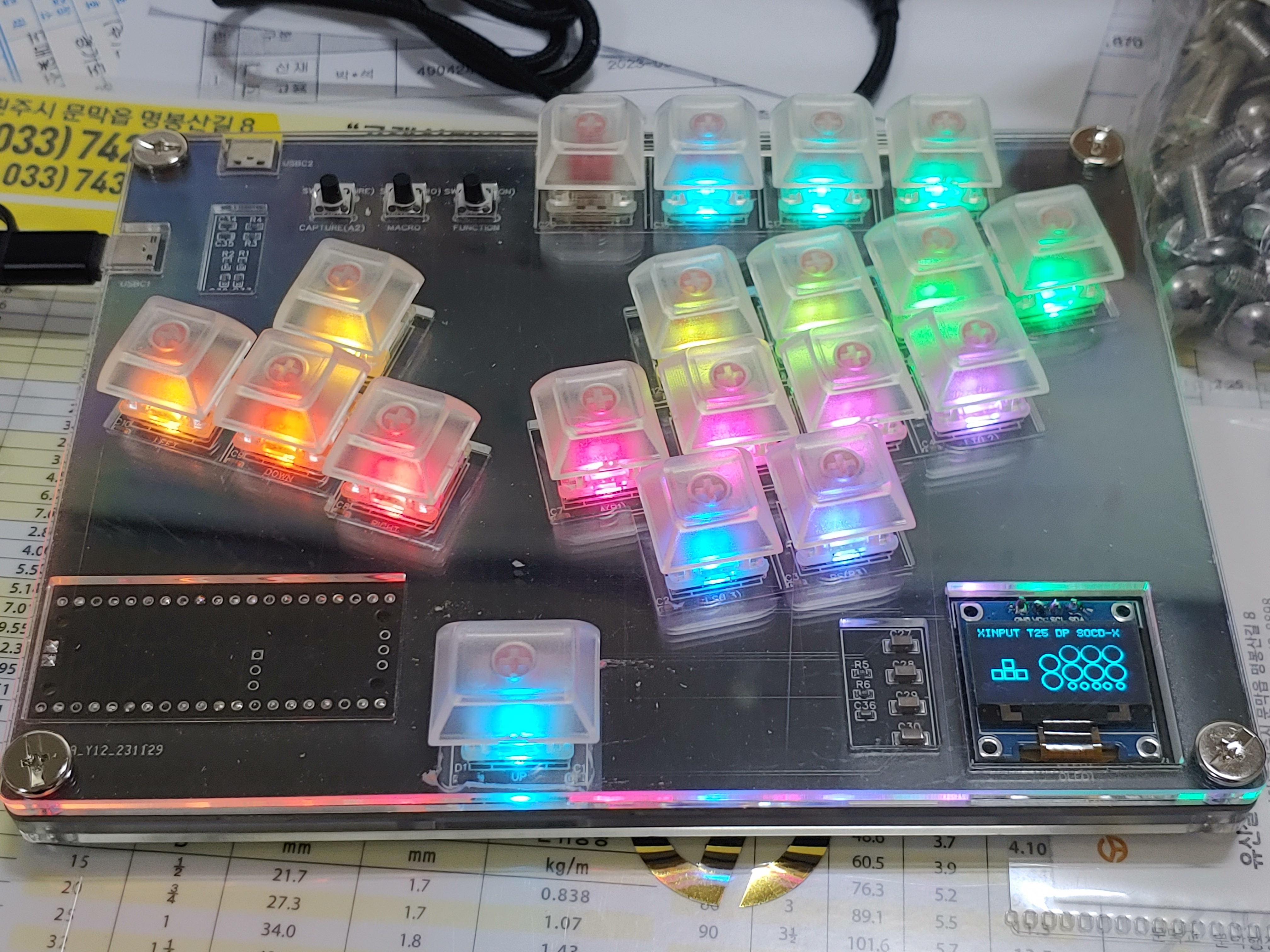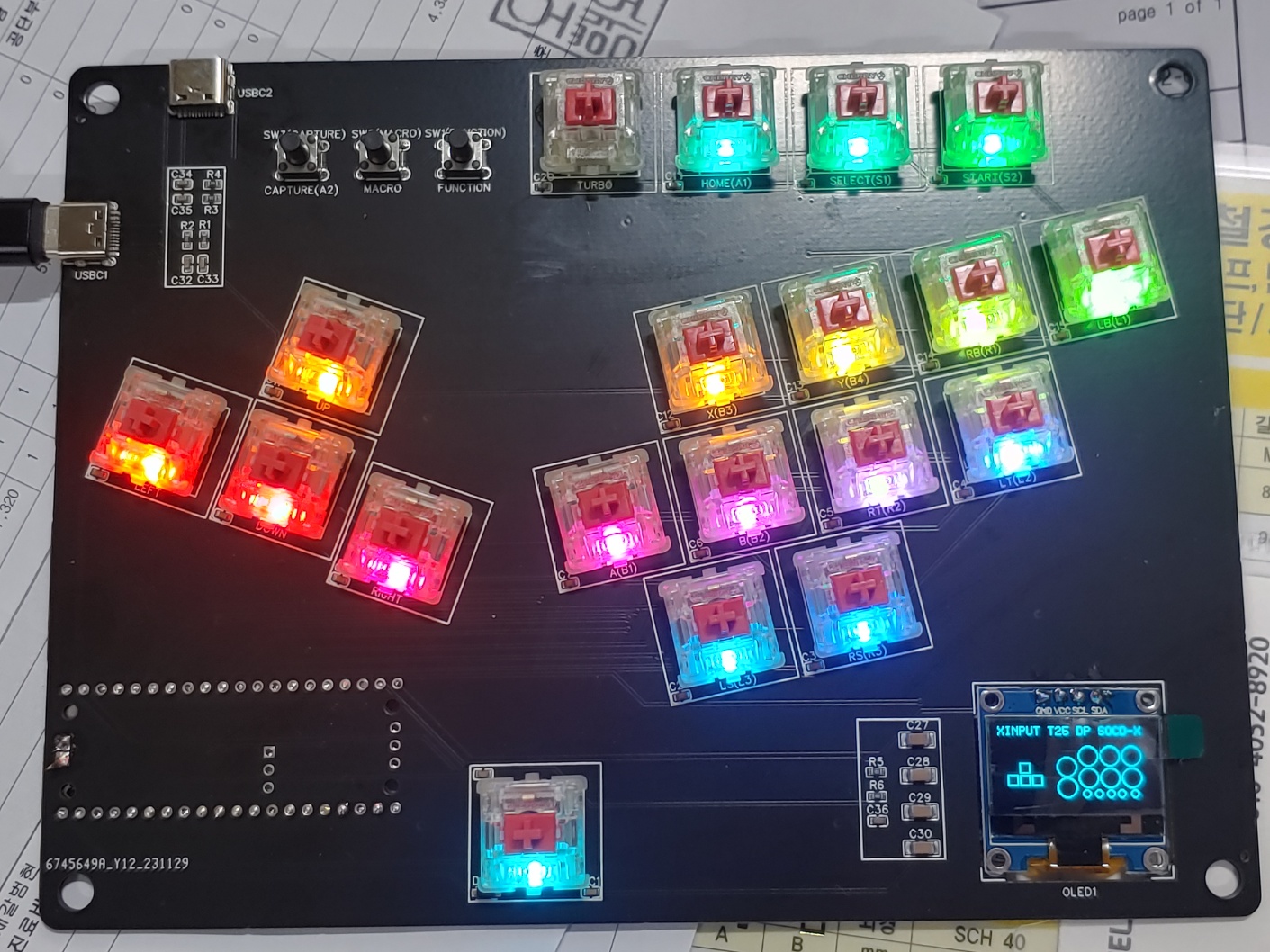 좌측 상단의 usb c에 연결한 모습. LED가 모두 동작하는데, 터보의 LED가 동작하지 않는다. 터보 LED 핀을 별도로 설정해줄 수 있음을 확인한 후, 라즈베리 파이 피코의 GPIO에 터보 LED 핀을 잡아줬지만 동작을 안 한다; 이유는 모르겠다. 이 때문에 다음 설계에서는 터보를 택트 스위치로 바꾸던가 해야겠다. 기본 설정 상으로 켤 수 있는 LED 숫자는 18개가 최대이기도 해서..